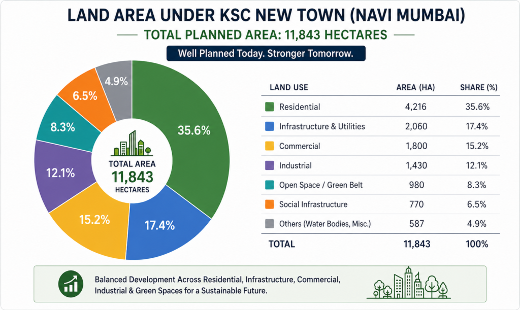 Recent land mapping indicates a significant share of the region is already under active occupation, while the remaining land is entering phased acquisition and infrastructure development. This shift marks the next stage of urban expansion in the Uran growth corridor.